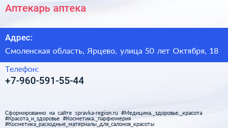 Аптекарь, аптека по адресу Смоленская область, Ярцево, улица 50 лет Октября, 18 в дальнейшем Организация, размещена в следующих категориях: