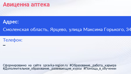 Авиценна, аптека по адресу Смоленская область, Ярцево, улица Максима Горького, 34 в дальнейшем Организация, размещена в следующих категориях:
