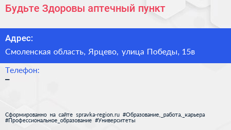 Будьте Здоровы!, аптечный пункт по адресу Смоленская область, Ярцево, улица Победы, 15в в дальнейшем Организация, размещена в следующих категориях: