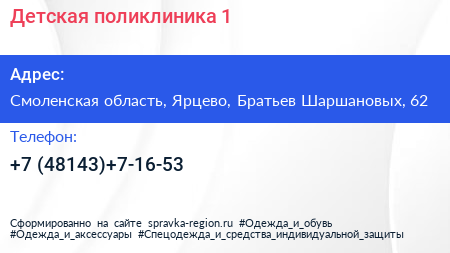 Детская поликлиника №1 по адресу Смоленская область, Ярцево, Братьев Шаршановых, 62 в дальнейшем Организация, размещена в следующих категориях: