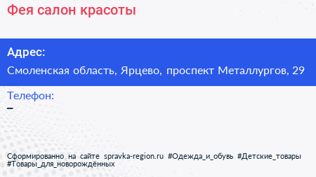 Фея, салон красоты по адресу Смоленская область, Ярцево, проспект Металлургов, 29 в дальнейшем Организация, размещена в следующих категориях: