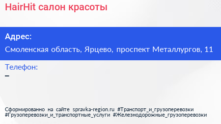 HairHit, салон красоты по адресу Смоленская область, Ярцево, проспект Металлургов, 11 в дальнейшем Организация, размещена в следующих категориях: