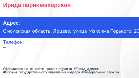 Ирида, парикмахерская по адресу Смоленская область, Ярцево, улица Максима Горького, 20 в дальнейшем Организация, размещена в следующих категориях:
