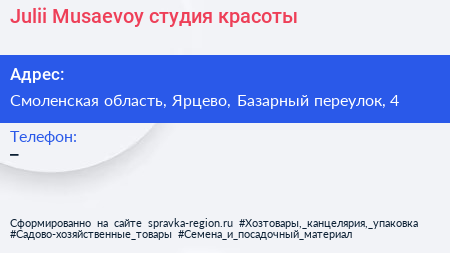 Julii Musaevoy, студия красоты по адресу Смоленская область, Ярцево, Базарный переулок, 4 в дальнейшем Организация, размещена в следующих категориях: