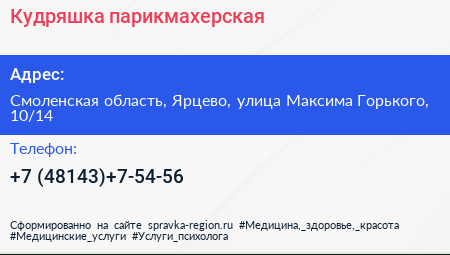 Кудряшка, парикмахерская по адресу Смоленская область, Ярцево, улица Максима Горького, 10/14 в дальнейшем Организация, размещена в следующих категориях: