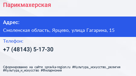 Парикмахерская по адресу Смоленская область, Ярцево, улица Гагарина, 15 в дальнейшем Организация, размещена в следующих категориях: