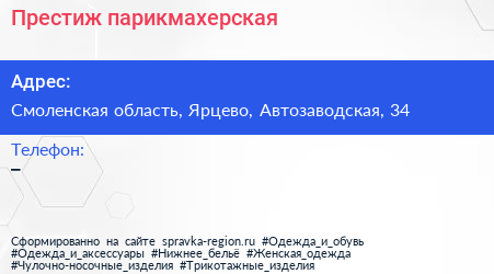 Престиж, парикмахерская по адресу Смоленская область, Ярцево, Автозаводская, 34 в дальнейшем Организация, размещена в следующих категориях:
