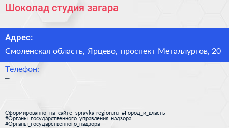 Шоколад, студия загара по адресу Смоленская область, Ярцево, проспект Металлургов, 20 в дальнейшем Организация, размещена в следующих категориях: