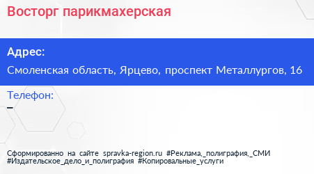 Восторг, парикмахерская по адресу Смоленская область, Ярцево, проспект Металлургов, 16 в дальнейшем Организация, размещена в следующих категориях: