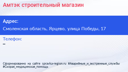 Амтэк, строительный магазин по адресу Смоленская область, Ярцево, улица Победы, 17 в дальнейшем Организация, размещена в следующих категориях: