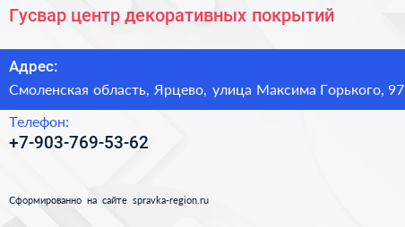 Гусвар, центр декоративных покрытий по адресу Смоленская область, Ярцево, улица Максима Горького, 97 в дальнейшем Организация, размещена в следующих категориях: