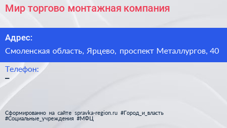 Мир, торгово-монтажная компания по адресу Смоленская область, Ярцево, проспект Металлургов, 40 в дальнейшем Организация, размещена в следующих категориях: