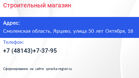 Строительный магазин по адресу Смоленская область, Ярцево, улица 50 лет Октября, 18 в дальнейшем Организация, размещена в следующих категориях: