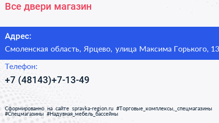 Все двери, магазин по адресу Смоленская область, Ярцево, улица Максима Горького, 13 в дальнейшем Организация, размещена в следующих категориях: