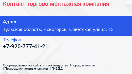 Контакт, торгово-монтажная компания по адресу Тульская область, Ясногорск, Советская улица, 13 в дальнейшем Организация, размещена в следующих категориях: