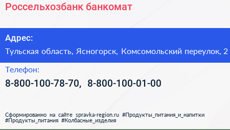 Россельхозбанк, банкомат по адресу Тульская область, Ясногорск, Комсомольский переулок, 2 в дальнейшем Организация, размещена в следующих категориях: