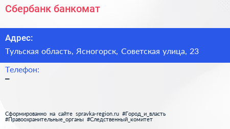 Сбербанк, банкомат по адресу Тульская область, Ясногорск, Советская улица, 23 в дальнейшем Организация, размещена в следующих категориях: