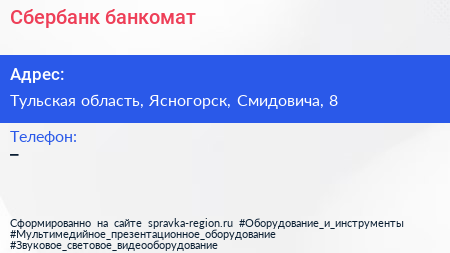 Сбербанк, банкомат по адресу Тульская область, Ясногорск, Смидовича, 8 в дальнейшем Организация, размещена в следующих категориях: