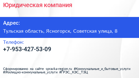 Юридическая компания по адресу Тульская область, Ясногорск, Советская улица, 8 в дальнейшем Организация, размещена в следующих категориях: