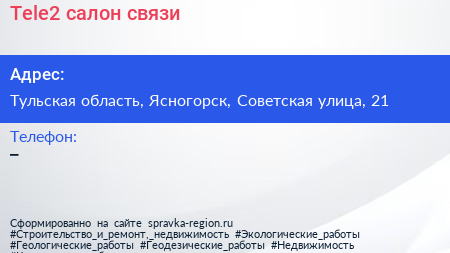 Tele2, салон связи по адресу Тульская область, Ясногорск, Советская улица, 21 в дальнейшем Организация, размещена в следующих категориях: