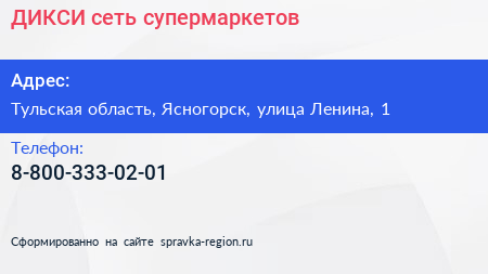 ДИКСИ, сеть супермаркетов по адресу Тульская область, Ясногорск, улица Ленина, 1 в дальнейшем Организация, размещена в следующих категориях: