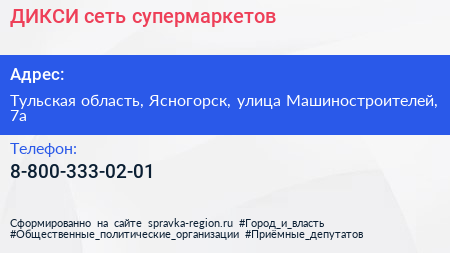 ДИКСИ, сеть супермаркетов по адресу Тульская область, Ясногорск, улица Машиностроителей, 7а в дальнейшем Организация, размещена в следующих категориях: