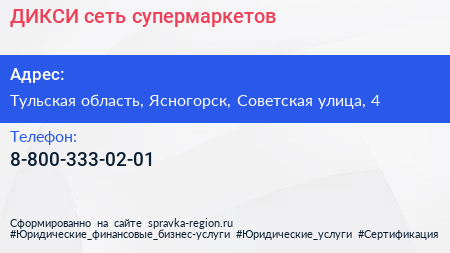 ДИКСИ, сеть супермаркетов по адресу Тульская область, Ясногорск, Советская улица, 4 в дальнейшем Организация, размещена в следующих категориях: