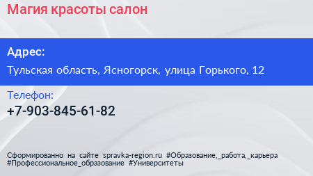 Магия красоты, салон по адресу Тульская область, Ясногорск, улица Горького, 12 в дальнейшем Организация, размещена в следующих категориях: