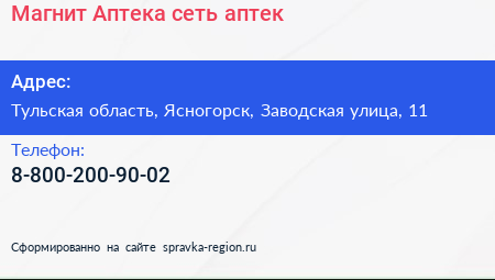 Магнит Аптека, сеть аптек по адресу Тульская область, Ясногорск, Заводская улица, 11 в дальнейшем Организация, размещена в следующих категориях: