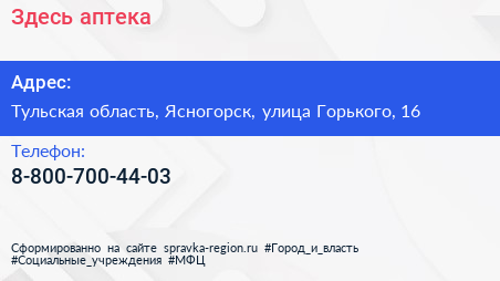 Здесь аптека по адресу Тульская область, Ясногорск, улица Горького, 16 в дальнейшем Организация, размещена в следующих категориях: