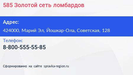 585*Золотой, сеть ломбардов по адресу 424000, Марий Эл, Йошкар-Ола, Советская, 128 в дальнейшем Организация, размещена в следующих категориях: