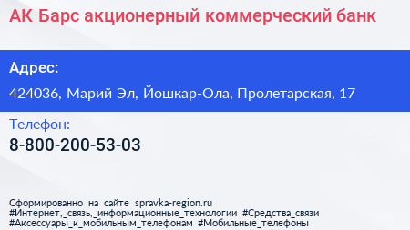АК Барс, акционерный коммерческий банк по адресу 424036, Марий Эл, Йошкар-Ола, Пролетарская, 17 в дальнейшем Организация, размещена в следующих категориях: