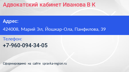 Адвокатский кабинет Иванова В.К. по адресу 424008, Марий Эл, Йошкар-Ола, Панфилова, 39 в дальнейшем Организация, размещена в следующих категориях: