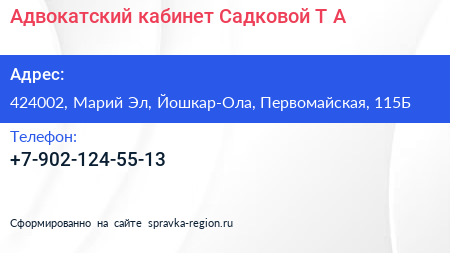 Адвокатский кабинет Садковой Т.А. по адресу 424002, Марий Эл, Йошкар-Ола, Первомайская, 115Б в дальнейшем Организация, размещена в следующих категориях: