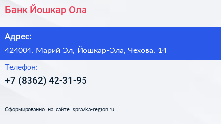 Банк Йошкар-Ола по адресу 424004, Марий Эл, Йошкар-Ола, Чехова, 14 в дальнейшем Организация, размещена в следующих категориях:
