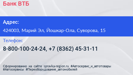 Банк ВТБ по адресу 424003, Марий Эл, Йошкар-Ола, Суворова, 15 в дальнейшем Организация, размещена в следующих категориях: