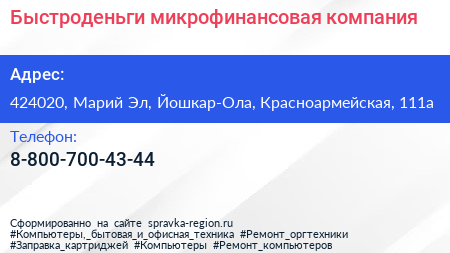 Быстроденьги, микрофинансовая компания по адресу 424020, Марий Эл, Йошкар-Ола, Красноармейская, 111а в дальнейшем Организация, размещена в следующих категориях: