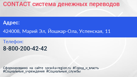 CONTACT, система денежных переводов по адресу 424008, Марий Эл, Йошкар-Ола, Успенская, 11 в дальнейшем Организация, размещена в следующих категориях: