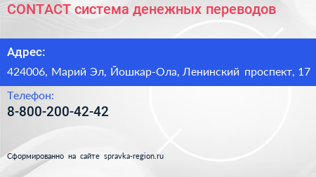 CONTACT, система денежных переводов по адресу 424006, Марий Эл, Йошкар-Ола, Ленинский проспект, 17 в дальнейшем Организация, размещена в следующих категориях: