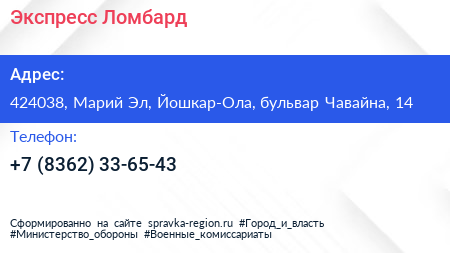 Экспресс Ломбард по адресу 424038, Марий Эл, Йошкар-Ола, бульвар Чавайна, 14 в дальнейшем Организация, размещена в следующих категориях: