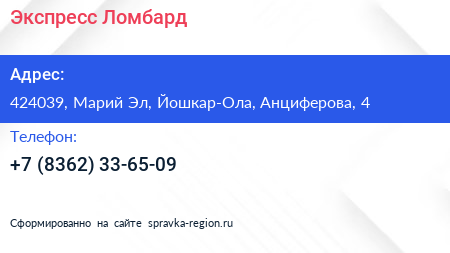 Экспресс Ломбард по адресу 424039, Марий Эл, Йошкар-Ола, Анциферова, 4 в дальнейшем Организация, размещена в следующих категориях: