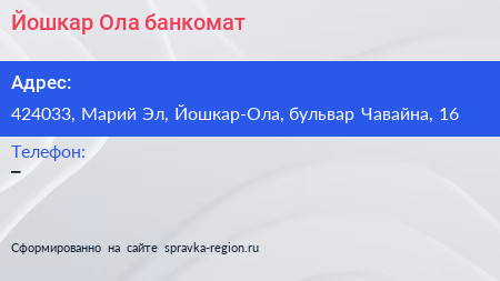 Йошкар-Ола, банкомат по адресу 424033, Марий Эл, Йошкар-Ола, бульвар Чавайна, 16 в дальнейшем Организация, размещена в следующих категориях: