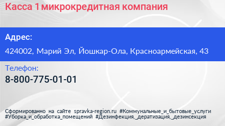 Касса №1, микрокредитная компания по адресу 424002, Марий Эл, Йошкар-Ола, Красноармейская, 43 в дальнейшем Организация, размещена в следующих категориях:
