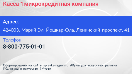 Касса №1, микрокредитная компания по адресу 424003, Марий Эл, Йошкар-Ола, Ленинский проспект, 41 в дальнейшем Организация, размещена в следующих категориях:
