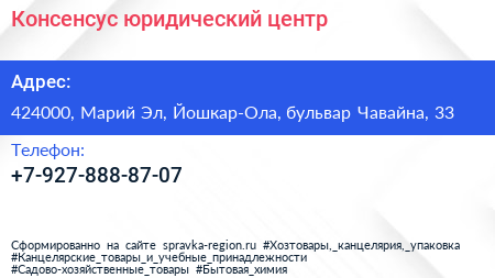 Консенсус, юридический центр по адресу 424000, Марий Эл, Йошкар-Ола, бульвар Чавайна, 33 в дальнейшем Организация, размещена в следующих категориях:
