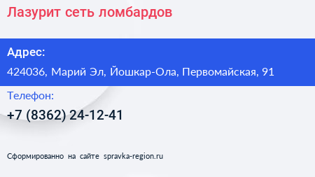 Лазурит, сеть ломбардов по адресу 424036, Марий Эл, Йошкар-Ола, Первомайская, 91 в дальнейшем Организация, размещена в следующих категориях: