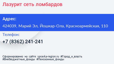 Лазурит, сеть ломбардов по адресу 424039, Марий Эл, Йошкар-Ола, Красноармейская, 110 в дальнейшем Организация, размещена в следующих категориях: