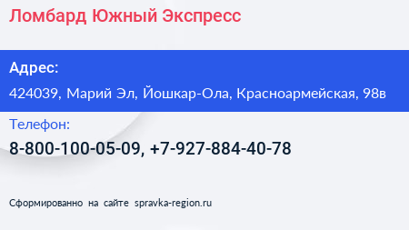 Ломбард Южный Экспресс по адресу 424039, Марий Эл, Йошкар-Ола, Красноармейская, 98в в дальнейшем Организация, размещена в следующих категориях: