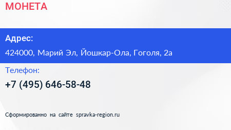 МОНЕТА по адресу 424000, Марий Эл, Йошкар-Ола, Гоголя, 2а в дальнейшем Организация, размещена в следующих категориях: