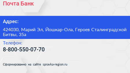 Почта Банк по адресу 424030, Марий Эл, Йошкар-Ола, Героев Сталинградской Битвы, 35а в дальнейшем Организация, размещена в следующих категориях:
